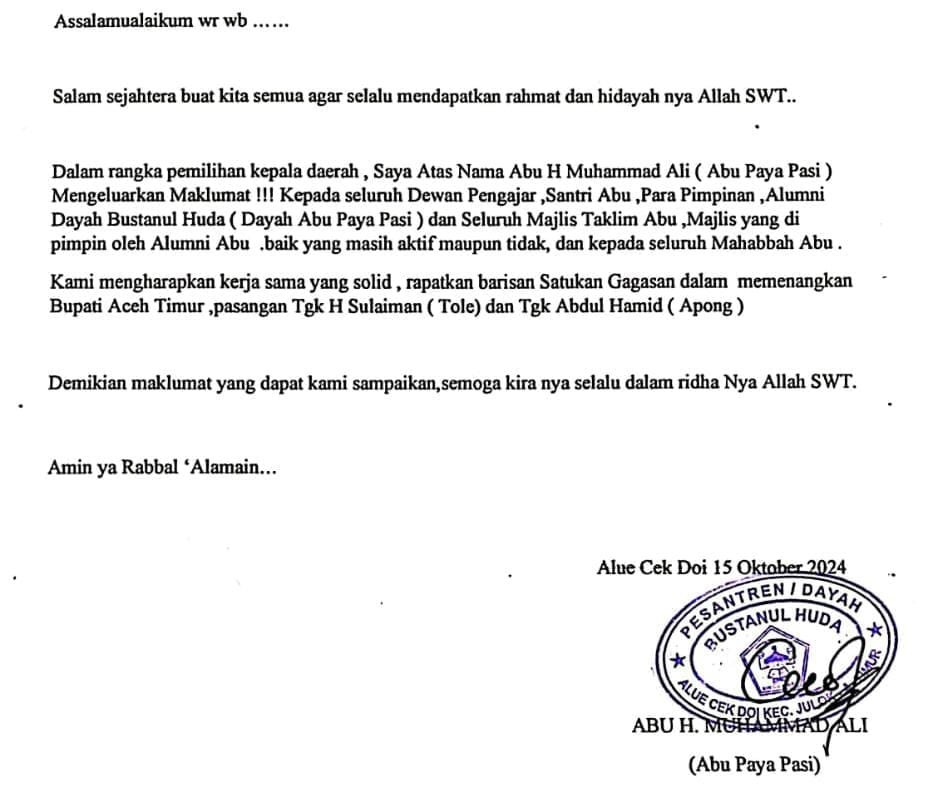 Dalam rangka pemilihan kepala daerah, saya, Abu Haji Muhammad Ali (Abu Paya Pasi), mengeluarkan maklumat kepada seluruh dewan pengajar, santri, pimpinan, alumni Dayah Bustanul Huda, serta seluruh majelis taklim yang dipimpin oleh para alumni, baik yang masih aktif maupun tidak, serta seluruh Mahabbah Abu.