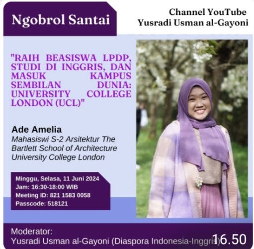 Ngobrol Santai “Raih Beasiswa LPDP, Studi di Inggris, dan Masuk Kampus Sembilan Dunia: University College London (UCL)” digelar secara daring, Selasa, 11 Juni 2024, pukul 16:30-18:00 WIB, langsung dimoderatori Yusradi Usman al-Gayoni (Diaspora Indonesia-Inggris). Lebih lanjut, bisa diikuti melalui tautan Zoom Meeting