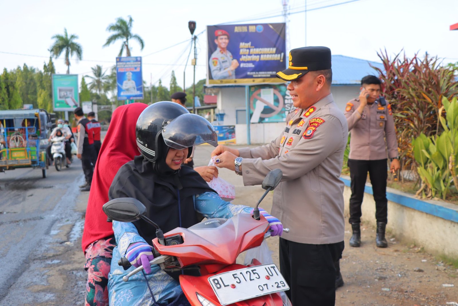 Terlihat Kapolres Aceh Tamiang AKBP Muliadi, S.H, M.H bersama PJU dan Personel turun langsung untuk membagikan takjil kepada para masyarakat pengguna jalan yang melintas.