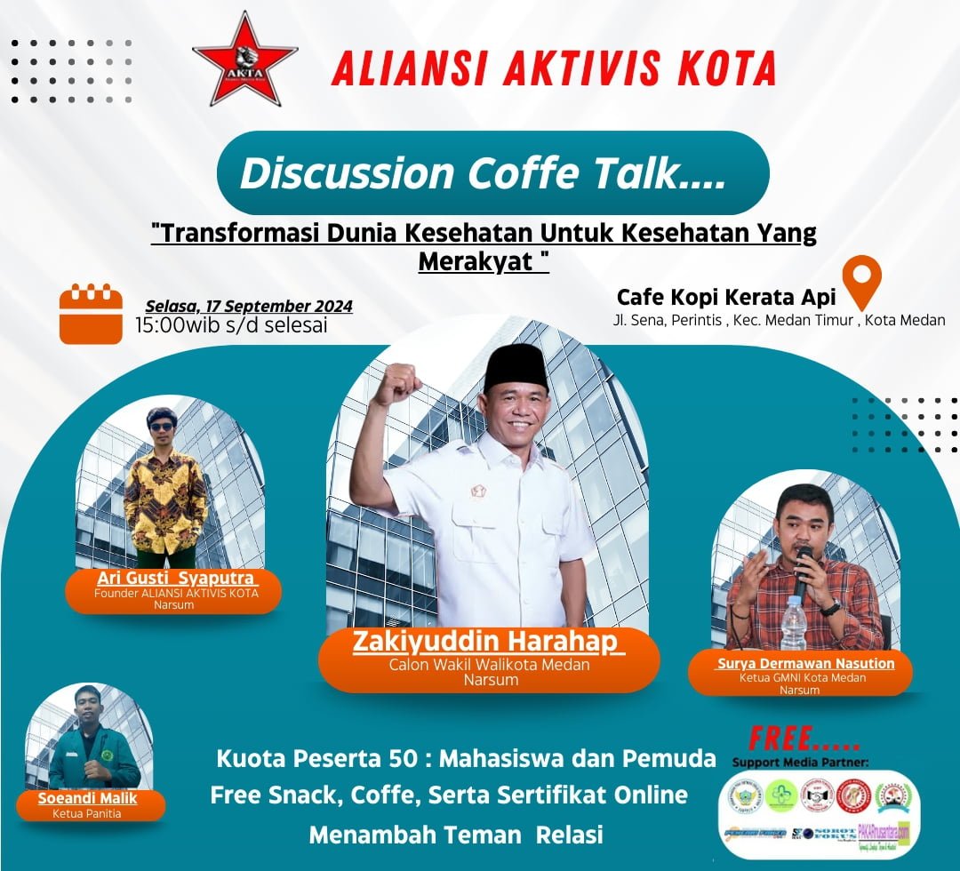 Medan- satupena.co.id: Aliansi Aktivis Kota (AKTA) kembali menggelar kegiatan diskusi yang menarik perhatian publik. Acara yang dikemas dalam format Discussion Coffee Talk ini mengambil tema yang relevan dengan kebutuhan masyarakat saat ini, yaitu “Transformasi Dunia Kesehatan untuk Kesehatan yang Merakyat”. Diskusi berlangsung hangat di salah satu kafe terkemuka di Medan, menghadirkan para pemateri yang berkompeten di bidangnya, kemarin 17/09/24.