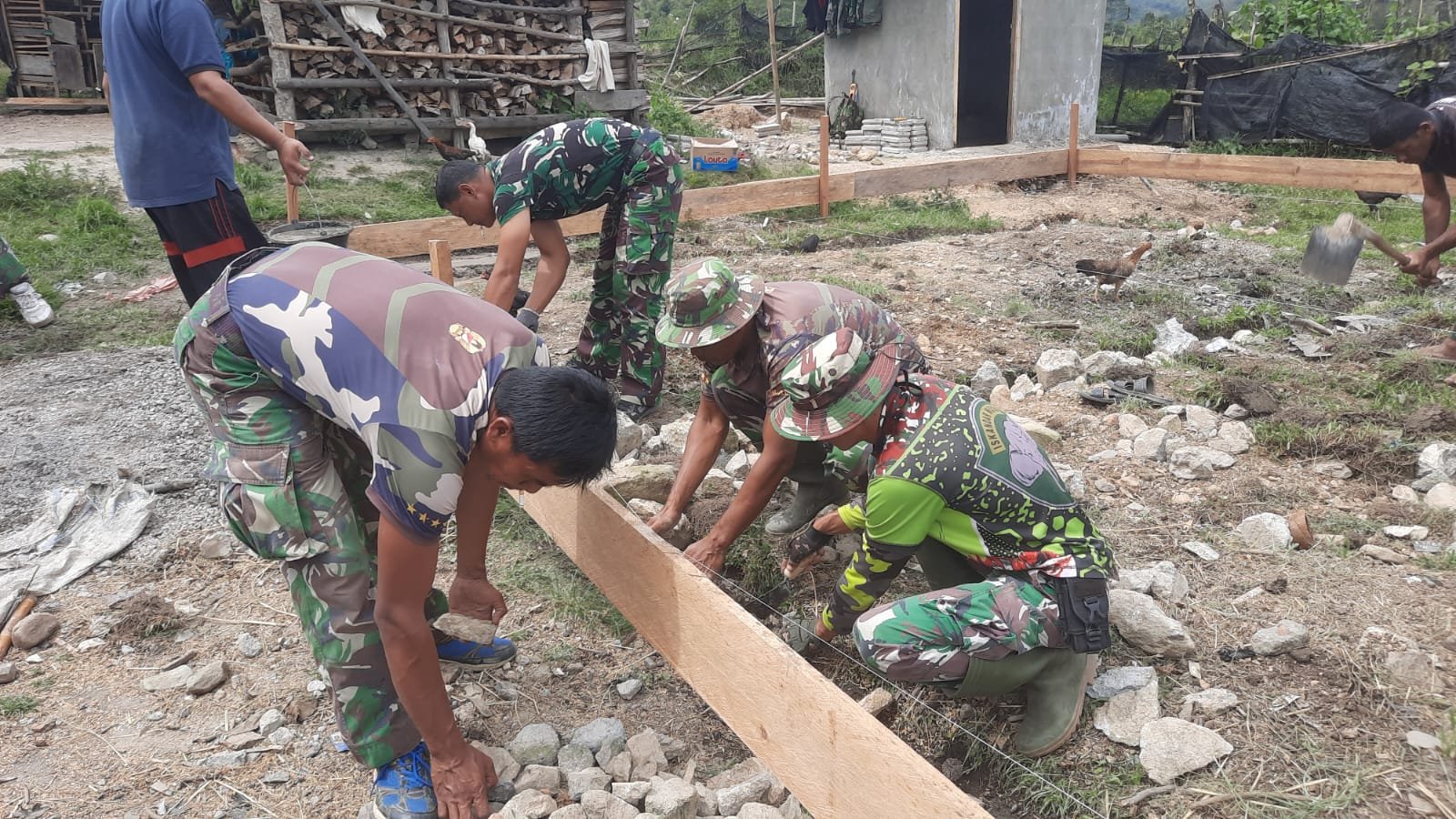 Anggota Satgas TMMD ke-121 tengah mulai membangun pondasi sasaran RTLH sebagai langkah awal perehaban di rumah salah satu warga yang mendapat bantuan rehabilitasi RTLH. Dengan dibantu warga sekitar, Anggota Satgas bekerja keras untuk mewujudkan perumahan yang layak bagi warga.