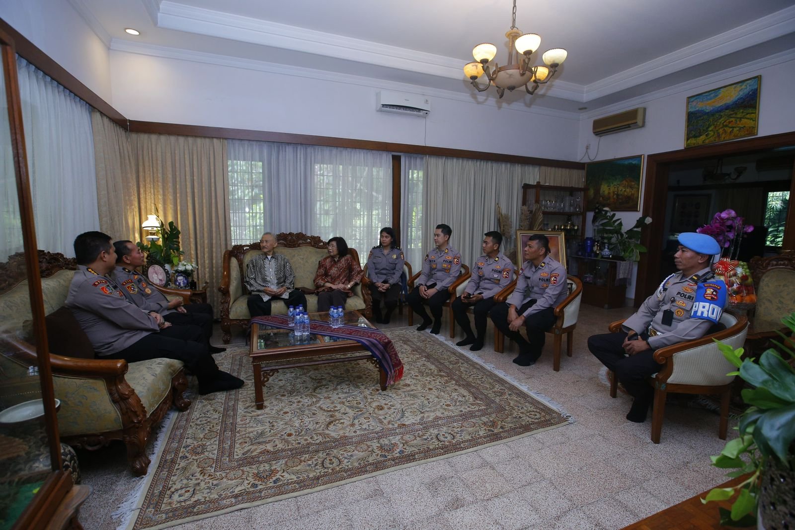 Dalam kunjungan tersebut, tim menyerahkan karangan bunga dan parcel buah sebagai tanda penghormatan. Suasana hangat dan penuh kekeluargaan terasa saat rombongan berbincang langsung dengan Jenderal (Purn.) Roesdihardjo. Beliau memberikan sejumlah pesan penting yang menekankan pada kesederhanaan dan kedekatan Polri dengan budaya dan masyarakat.
