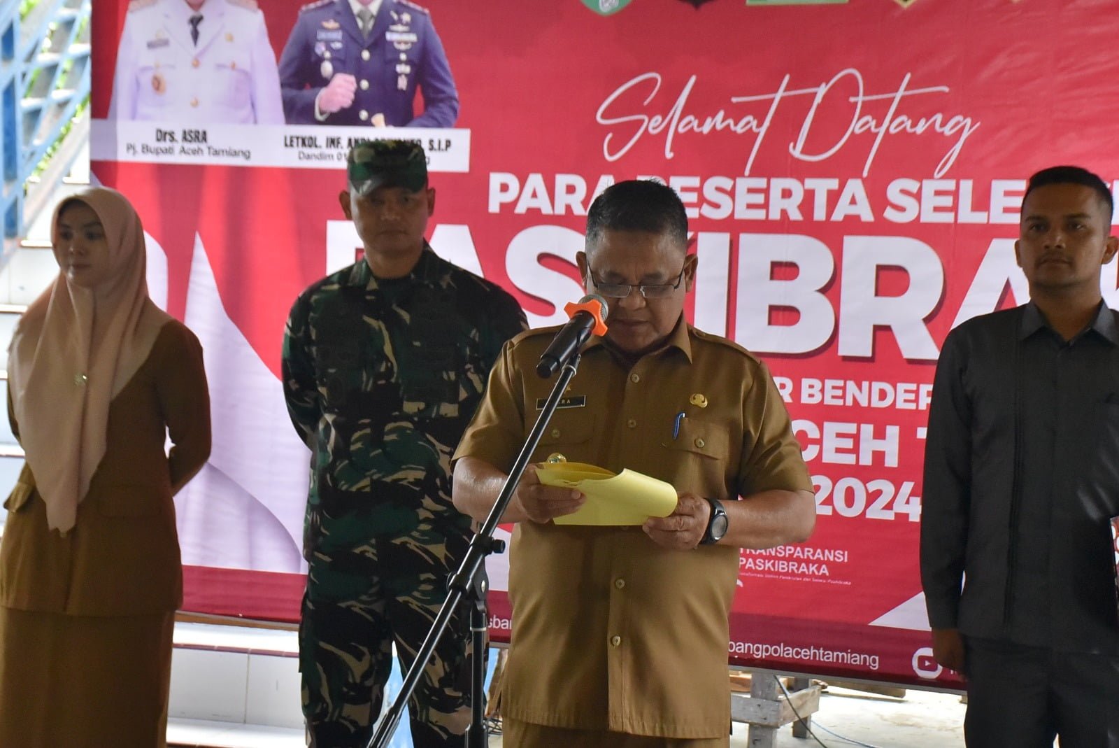 Pj. Bupati Aceh Tamiang, Drs. Asra, memimpin langsung apel pembukaan tanda dimulainya seleksi calon Paskibra Tahun 2024. Kegiatan dilaksanakan di Kantor Badan Kesbangpol setempat, pada Senin (19/02/2024).
