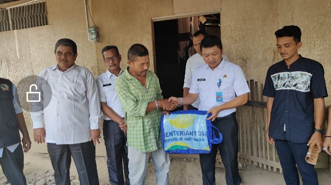 Pidie Jaya-satupena.co.id: Plt Kepala Dinas Sosial, Pemberdayaan Perempuan dan Perlindungan Anak (Dinsos P3A) Kabupaten Pidie Jaya, Agusmaidi, menyerahkan bantuan Masa Panik kepada korban bencana alam (puting beliung) di Gampong Blang Miroe, Kecamatan Bandar Dua, Pidie Jaya, Aceh, Selasa, 07/05/2024.
