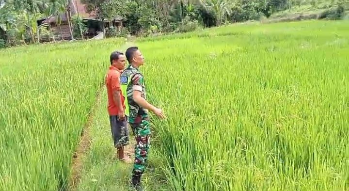 Babinsa Koramil 05/Tamiang Hulu Serda Edi Witoko bersama Petani melaksanakan kegiatan memantau perkembangan tanaman padi, milik Bapak Ponidi di Desa Perkebunan Pulau Tiga, Kecamatan Tamiang Hulu, Kabupaten Aceh Tamiang, pada Senin (13/01/2025)