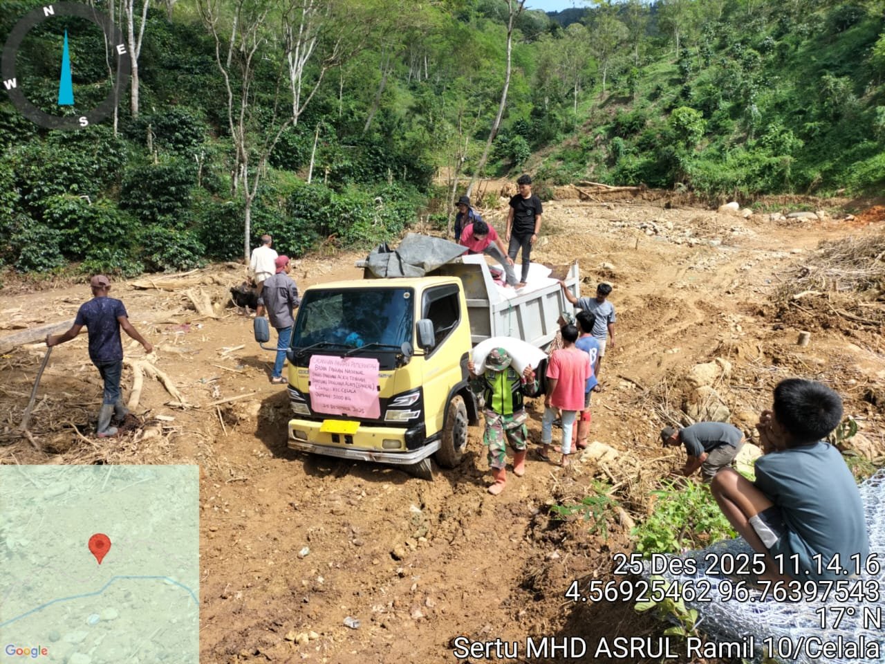 Serka Asrul, Babinsa Koramil 10/Celala Kodim 0106 Aceh Tengah, bersama unsur Muspika Kecamatan Celala melaksanakan pendistribusian bantuan sembako berupa beras sebanyak 5.000 kilogram untuk masyarakat di 17 desa yang berada di Kecamatan Celala, Kabupaten Aceh Tengah, pada Kamis, 25 Desember 2025.