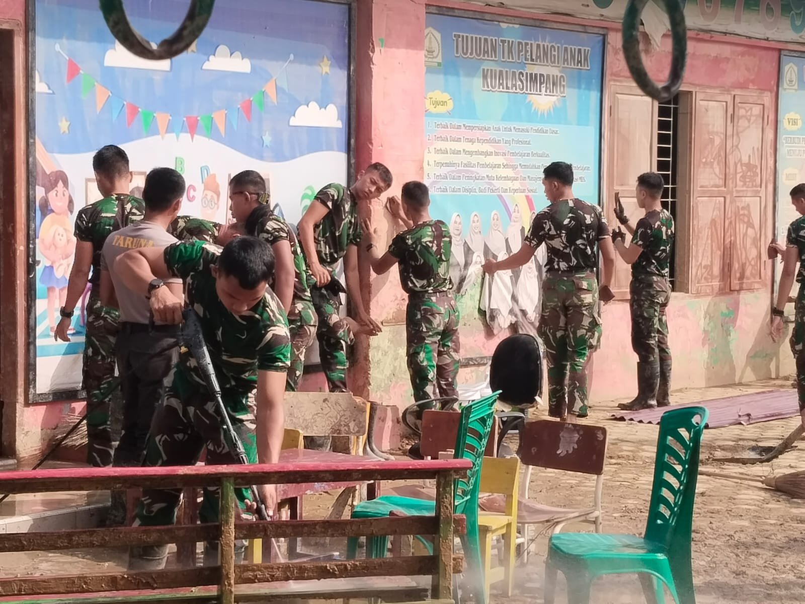 Aceh Tamiang– Satupena.co.id: Babinsa Koramil 01/Kuala Simpang bersama Taruna, Taruni Akmil dan Akpol melaksanakan pembersihan TK Pelangi Bukit tempurung sisa lumpur pasca banjir di Desa Bukit Tempurung, Kecamatan Kota Kuala Simpang, Kabupaten Aceh Tamiang, pada Selasa (03/02/2026)