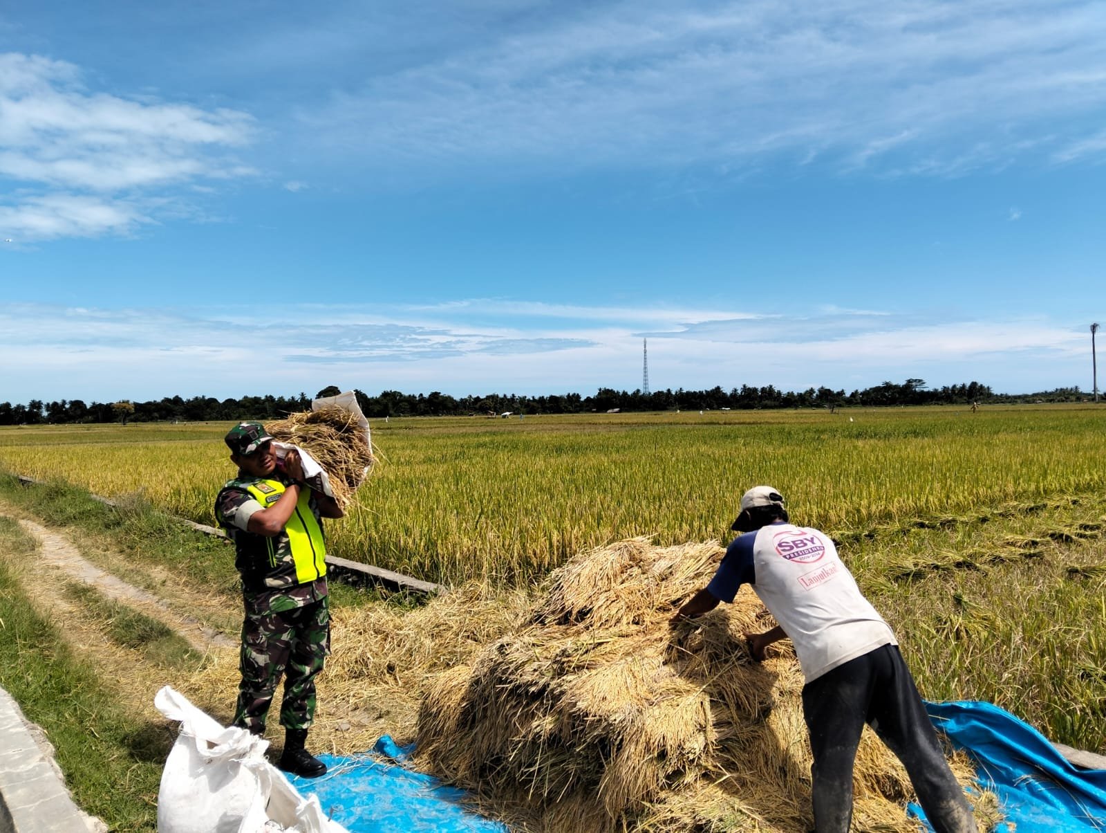 Dengan semangat, Serma Yoyon tak hanya ikut memanen, tetapi juga membantu mengangkat hasil padi dan merontokkan bulir-bulir padi menggunakan mesin sederhana. Suara mesin perontok berpadu dengan tawa para petani, menciptakan suasana hangat di tengah kesibukan panen.