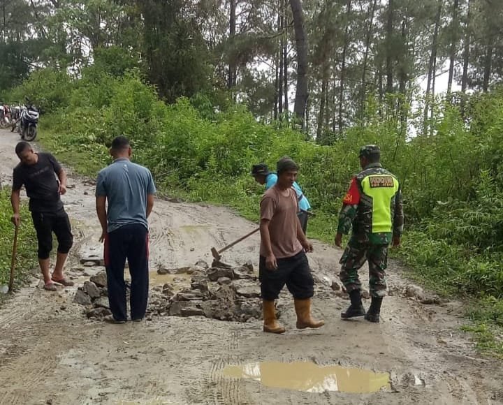 Babinsa Koramil 05/Linge Bersama Warga Gotong Royong Bersihkan Jalan Desa Umang,