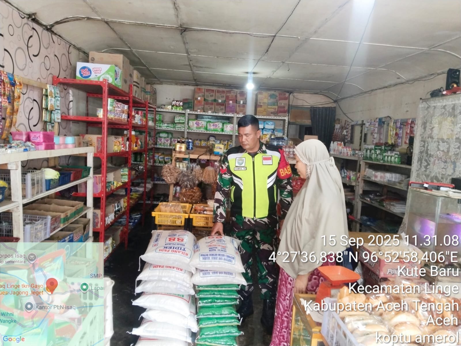 Aceh Tengah, Satupena.co.id.– Dalam rangka memantau kestabilan harga kebutuhan pokok di wilayah binaannya, Babinsa Koramil 05/Linge, Kodim 0106/Aceh Tengah, Koptu Amirul Mukminin melaksanakan kegiatan pengecekan harga sembako di sejumlah warung yang berada di pusat Kecamatan Linge, Senin (16/9/2025).