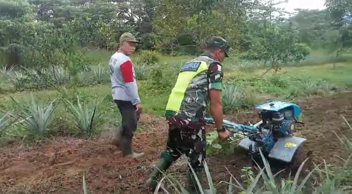 Babinsa Koramil 05/Tamiang Hulu Serda Sugiatno melaksanakan pendampingan petani pada Poktan yang sedang pengolahan tanah untuk tanaman Terong seluas ± 3,5 Rante milik Bapak karmen untuk mensukseskan ketahanan pangan di Desa Jambo Rambong, Kecamatan Bandar pusaka, Kabupaten Aceh Tamiang, pada Rabu (29/01/2025)