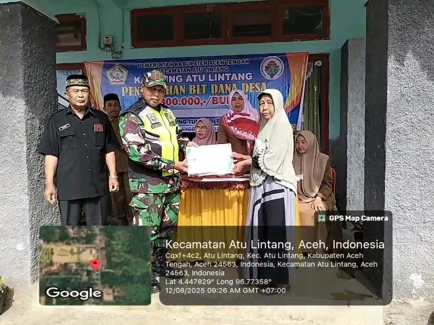 Aceh Tengah, Satupena.co.id. – Babinsa Koramil 07/Atu Lintang, Kodim 0106/Aceh Tengah, Sertu Moh. Muhni, turut mendampingi aparatur Desa Atu Lintang dalam kegiatan penyaluran Bantuan Langsung Tunai (BLT) kepada warga penerima manfaat. Kegiatan ini berlangsung di kantor desa setempat, Selasa (12/8/2025).