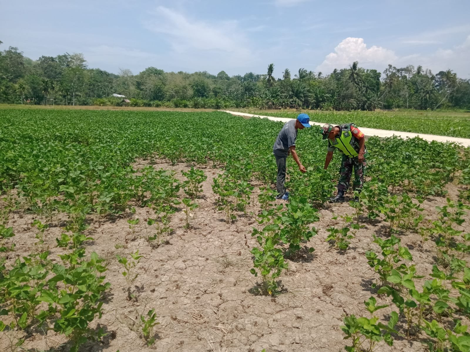 Dalam rangka mewujudkan program swasembada pangan, Babinsa Koramil 08/Rantau Serma Saiful Muhni langsung terjun ke lahan yang ditanami kedelai. Babinsa tersebut membantu petani membersihkan rumput dan sekaligus juga mengecek kondisi dari tanaman kedelai milik petani di Desa Suka Rahmat, Kecamatan Rantau, Kabupaten Aceh Tamiang. Rabu (01/05/2024)