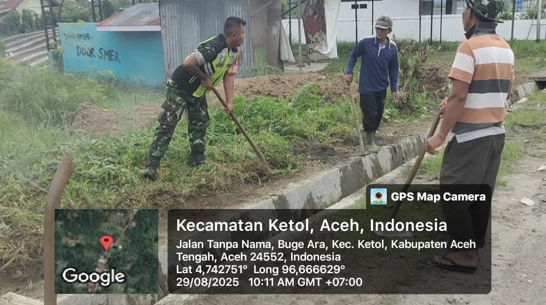 Aceh Tengah, Satupena.co.id. – Dalam upaya menjaga kebersihan lingkungan serta mempererat kebersamaan dengan masyarakat, Babinsa Koramil 09/Ketol, Kodim 0106/Aceh Tengah, Serka Suyanto melaksanakan kegiatan gotong royong bersama warga di sektor Meunasah Desa Buge Ara, Kecamatan Ketol, Kabupaten Aceh Tengah, pada Jumat (29/08/2025).
