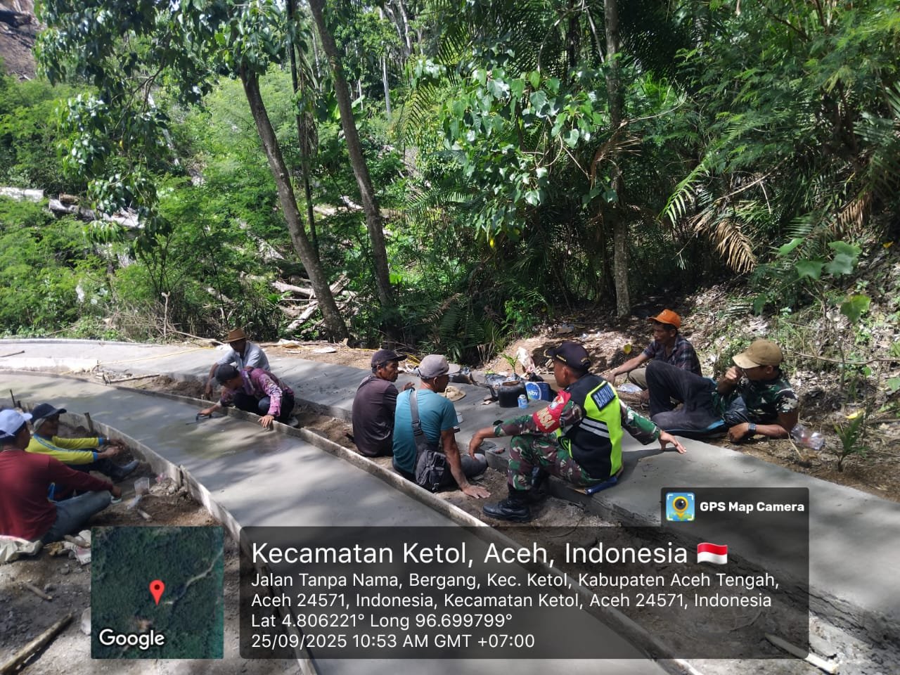Aceh Tengah, Satupena.co.id – Babinsa Koramil 09/Ketol, Kodim 0106/Aceh Tengah, Sertu Sabarudin, melaksanakan kegiatan Komunikasi Sosial (Komsos) sekaligus bergotong-royong bersama masyarakat dalam pembangunan jalan rabat beton di Desa Pantan Reduk, Kecamatan Ketol, Kabupaten Aceh Tengah, Jumat (26/9/2025).