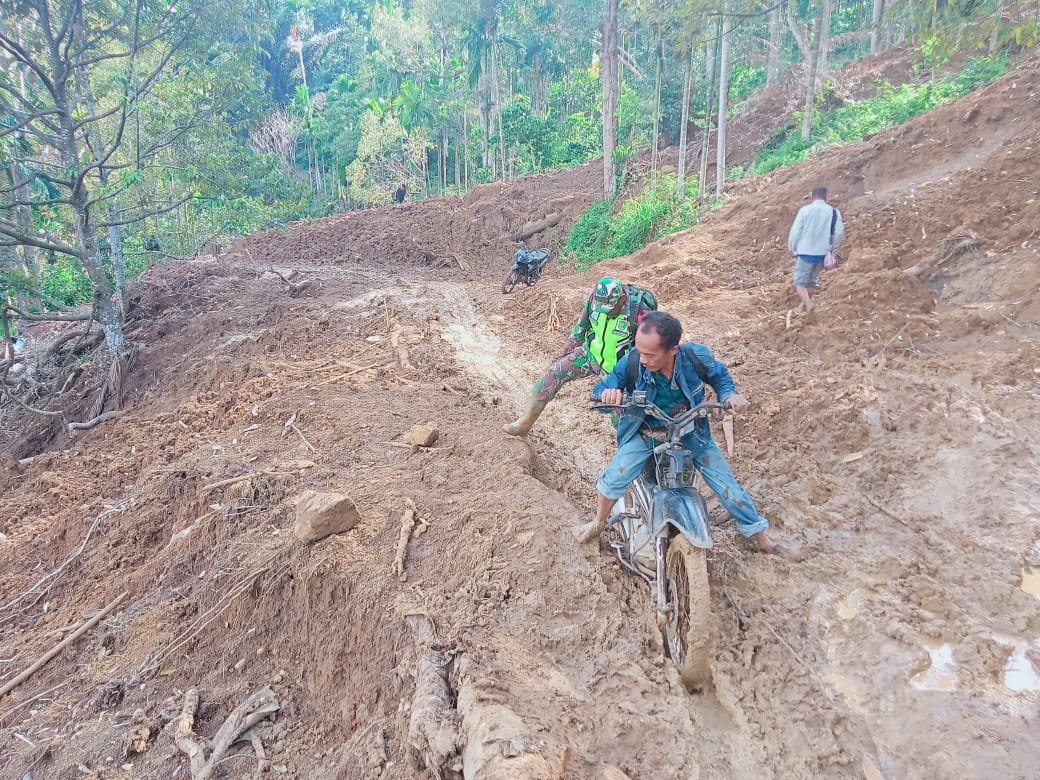 Melihat situasi tersebut, Serma Sarno dengan sigap membantu warga melewati titik longsor yang licin dan berbahaya. Ia turut mendampingi serta membantu mendorong kendaraan roda dua milik warga yang membawa hasil pertanian agar dapat melintas dengan aman.