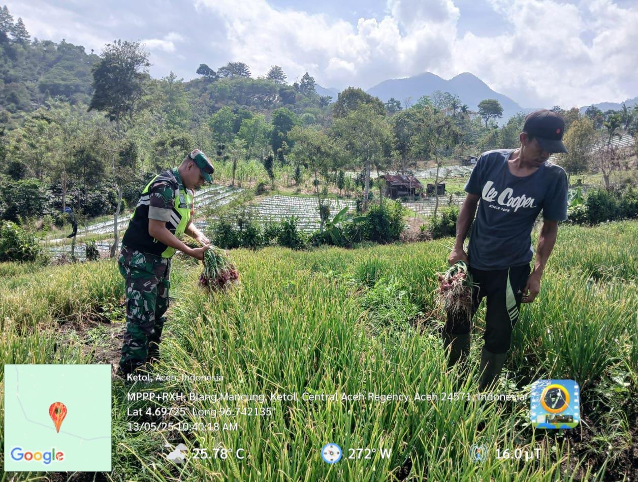 Aceh Tengah , Satupena.co.id.– Sebagai bentuk dukungan terhadap program ketahanan pangan nasional, Babinsa Koramil 09/Ketol Kodim 0106/Aceh Tengah, Serda Aan Puji S, turut membantu warga dalam kegiatan panen bawang merah di Desa Blang Mancung, Kecamatan Ketol, Kabupaten Aceh Tengah.Rabu, 14 Mei 2025.