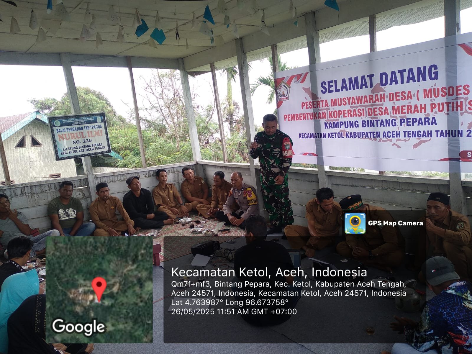 Aceh Tengah, Satupena.co.id. – Dalam upaya mendukung pemberdayaan ekonomi masyarakat desa, Babinsa Koramil 09/Ketol Kodim 0106/Aceh Tengah, Serka Arif Hananto menghadiri musyawarah pembentukan Koperasi Merah Putih yang berlangsung di Tempat Pengolahan Akhir (TPA) Kampung Bintang Pepara, Kecamatan Ketol, Kabupaten Aceh Tengah, pada Selasa (27/5/2025).