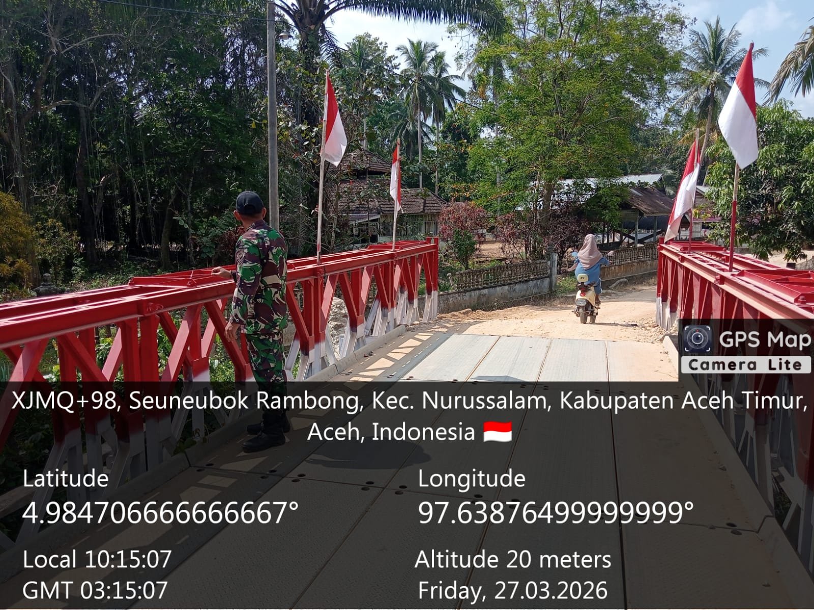 Aceh Timur, Satupena.co.id: Babinsa Koramil 09/Nurussalam Kodim 0104/Aceh Timur kembali menunjukkan kepeduliannya terhadap infrastruktur wilayah dengan melaksanakan patroli sekaligus pengecekan jembatan Baley di Gampong Seunebok Rambong, Kecamatan Nurussalam, Kabupaten Aceh Timur, Jumat (27/03/2026).