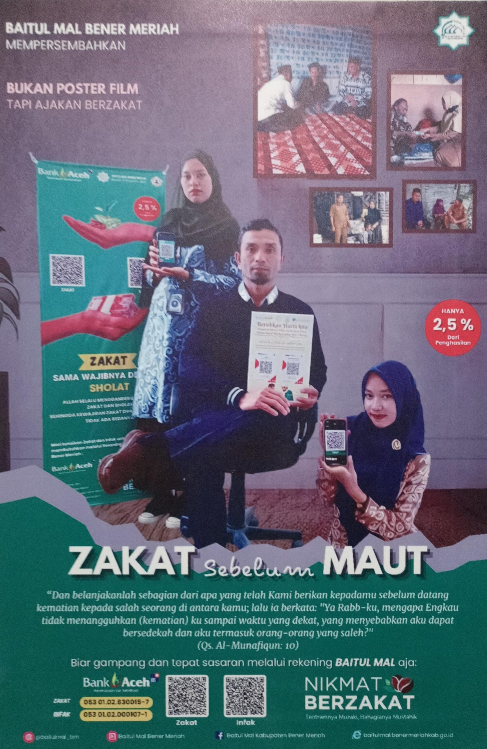 Poster juga menampilkan kutipan ayat Al-Qur’an dari Surah Al-Munafiqun ayat 10 yang mengingatkan manusia agar menginfakkan sebagian rezeki sebelum datang penyesalan di akhir hayat. Pesan religius ini diperkuat dengan visual aktivitas penyaluran zakat kepada masyarakat yang membutuhkan.