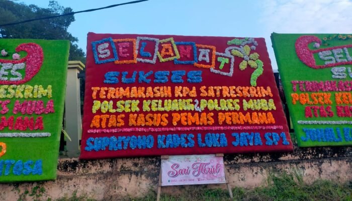 Tampak sejak pagi didepan halaman kantor Mapolsek Keluang terlihat berjejer papan bunga ucapan terimakasih dari masyarakat atas keberhasilan Sat Reskrim Polres Musi Banyuasin (Muba) dan Polsek Keluang atas mengungkap kasus pembunuhan. Selasa (28/05/2024)