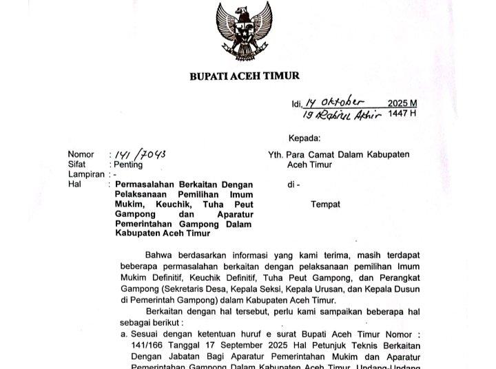 Surat Bupati Aceh Timur Nomor 141/7043 tentang permasalahan pelaksanaan pemilihan imum, mukim, keuchik dan aparatur gampong yang diterbitkan pada 14 Oktober 2025 dinilai menimbulkan polemik dan berpotensi menciptakan ketidakpastian hukum. Karena itu, dokumen tersebut layak untuk ditinjau ulang.