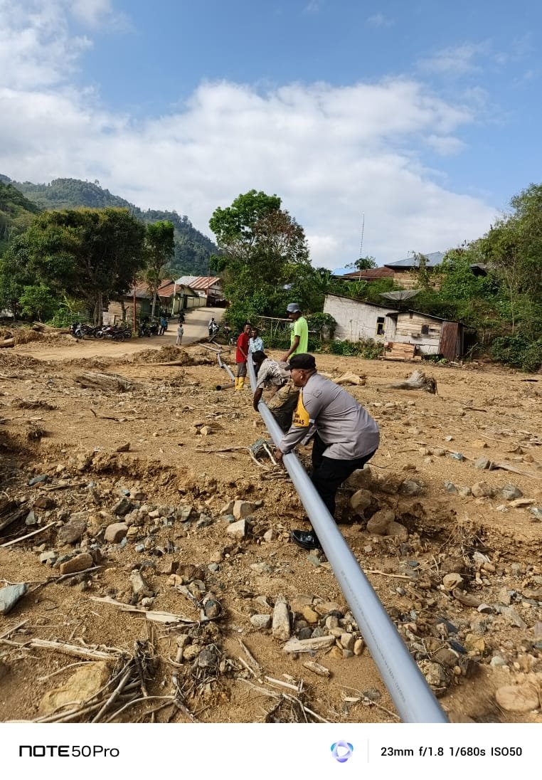 Dalam pelaksanaannya, Bhabinkamtibmas bersama aparatur kampung dan warga setempat bahu-membahu memasang peralon agar aliran air dapat kembali menjangkau rumah-rumah penduduk. Kerja sama ini menjadi wujud sinergi antara Polri dan masyarakat dalam mempercepat pemulihan fasilitas dasar.