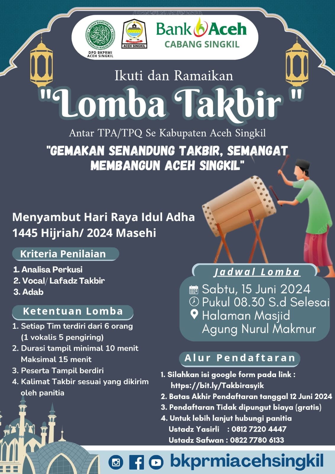 Singkil, Satupena– Dalam rangka menyambut dan memeriahkan Hari Raya Idul Adha 1445 H/2024 M, DPD BKPRMI Aceh Singkil akan menggelar Lomba Takbir tingkat Remaja/TPA se-Kabupaten Aceh Singkil.