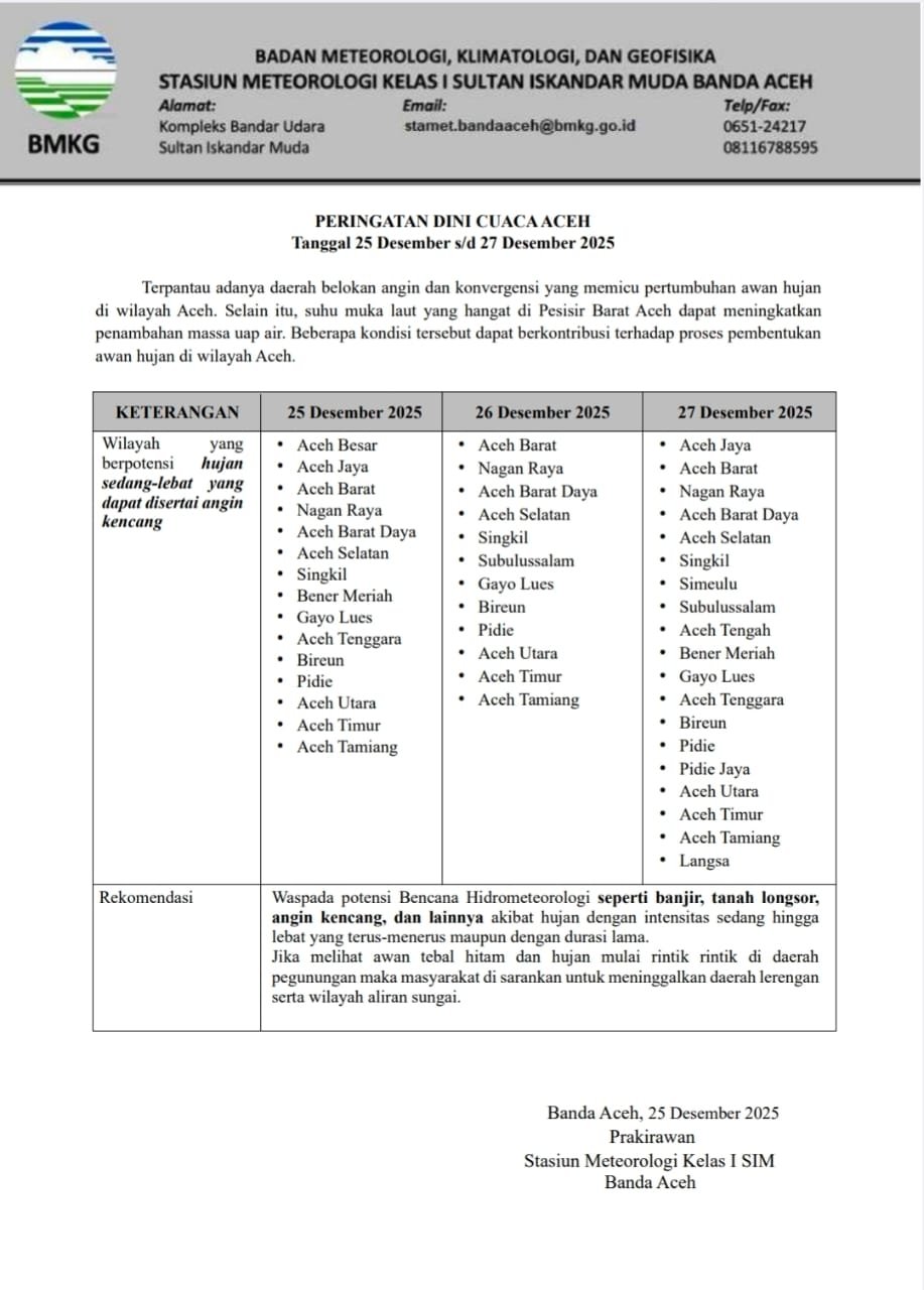 Peringatan dini ini dikeluarkan oleh Stasiun Meteorologi Kelas I SIM Banda Aceh pada 25 Desember 2025. Masyarakat diimbau untuk terus memantau perkembangan informasi cuaca terkini melalui kanal resmi BMKG dan meningkatkan kesiapsiagaan guna meminimalkan risiko dan dampak dari cuaca ekstrem.