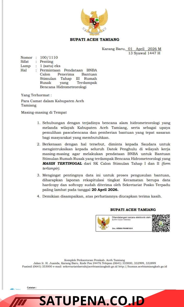 Aceh Tamiang –Satupena.co.id: Pemerintah Kabupaten Aceh Tamiang mengimbau masyarakat yang terdampak bencana hidrometeorologi agar segera memastikan diri telah terdaftar sebagai penerima bantuan pemerintah. Imbauan ini disampaikan seiring pelaksanaan pendataan ulang penerima bantuan stimulan rumah rusak Tahap III.