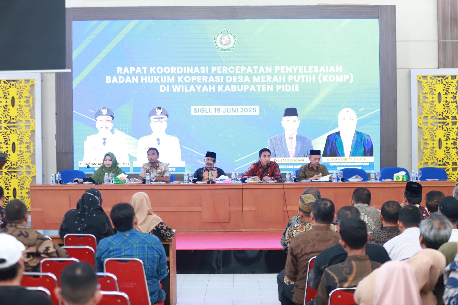 Sigli – Bupati Pidie H. Sarjani Abdullah, S.H menghadiri Rapat Koordinasi Percepatan Penyelesaian Badan Hukum Koperasi Desa Merah Putih (KDPM) di Wilayah Kabupaten Pidie, acara tersebut yang berlangsung di Oproom Kantor Bupati. Kamis (19/06/2025),