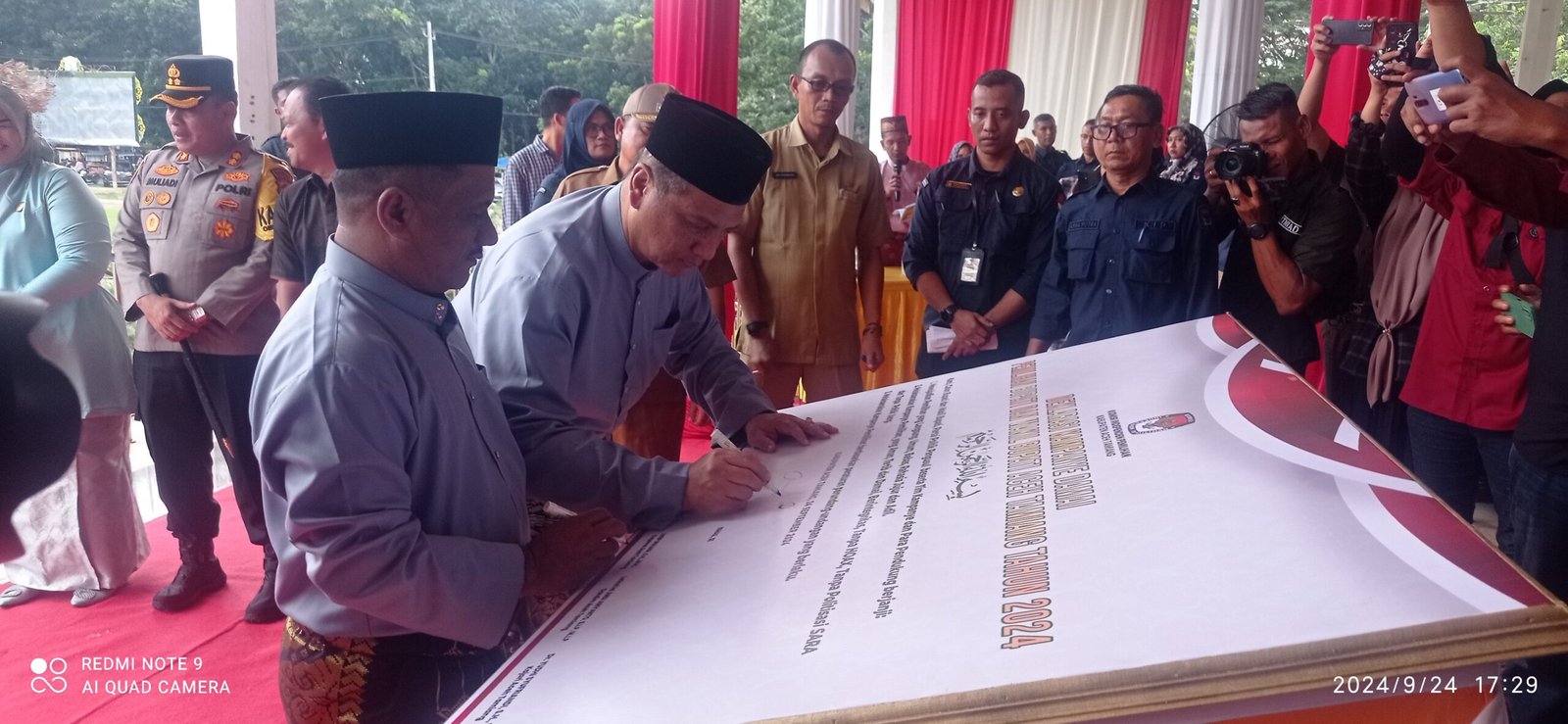Pantauan awak media dilokasi diakhir kegiatan Calon Bupati Aceh Tamiang Irjen Pol Drs. Armia Fahmi, SH, MH dan calon wakil Bupati Ismail, SE, Ketua KIP Aceh Tamiang Beserta Forkopimda melakukan penandatanganan deklarasi kampanye damai Calon Bupati Dan Wakil Bupati Priode 2024-2029..(Eri Beo).