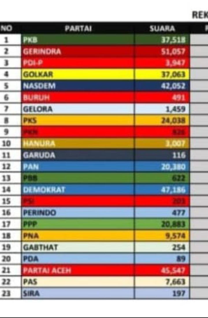 Sementara itu perolehan Parpol untuk DPRA Dapil 9, Partai Gerindra Masih menguasai dengan 51,057 suara, Demokrat 47,186 suara, Partai Aceh 45,547 suara, Nasdem 42,052 suara, PKB 37,518 suara, Golkar 37,063 suara, PKS 24,038 suara, PPP 20,883 suara, dan PAN 20,380 suara.