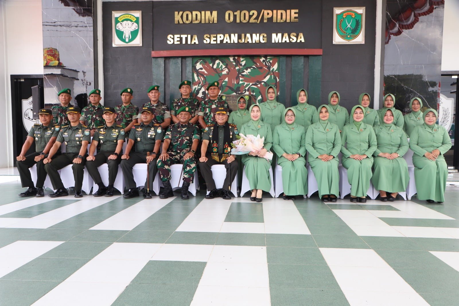 Pidie – Komandan Kodim 0102/Pidie, Letkol Inf Abd. Jamal Husin M. Han, beserta Ketua Persit Kartika Chandra Kirana Cabang XIX Kodim 0102/Pidie, Ny. Devi Jamal, menyambut kedatangan Panglima Komando Daerah Militer Iskandar Muda (Pangdam IM), Mayor Jenderal TNI Niko Fahrizal, M.Tr.(Han), beserta Ketua Persit Kartika Chandra Kirana Daerah Iskandar Muda, Ny. Eva Niko Fahrizal, di Makodim 0102/Pidie, Jalan Prof Amajid Ibrahim, Kecamatan Pidie, Kabupaten Pidie, pada Jumat (09/08/24).