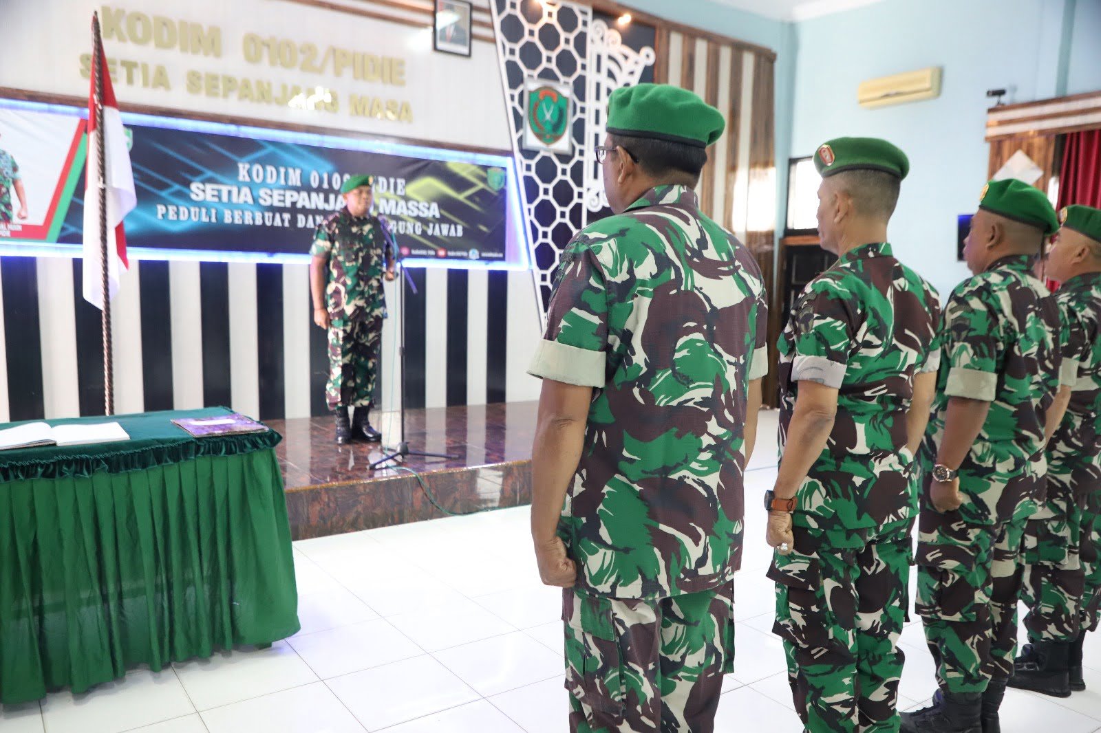 Pidie – Komandan Kodim (Dandim) 0102/Pidie, Letkol Inf Abd. Jamal Husin, M.Han, memimpin upacara serah terima jabatan (sertijab) Kasdim dan Danramil di jajaran Kodim 0102/Pidie. Upacara ini berlangsung di Aula Yudha Makodim 0102/Pidie, Kabupaten Pidie. Selasa (03/09/2024).
