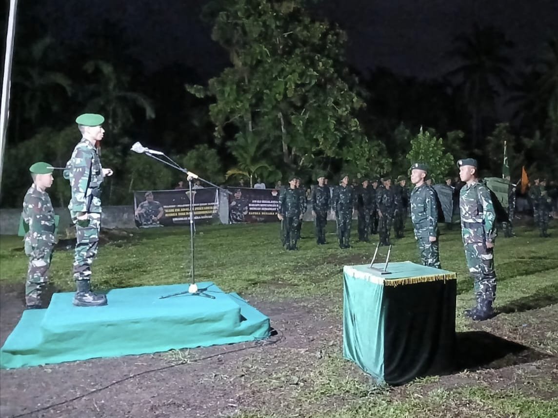 Pidie – Komandan Komando Distrik Militer (Dandim) 0102/Pidie, Letkol Inf Andi Irsan M. Han., memimpin upacara serah terima Peleton Beranting Yudha Wastu Pramuka Jaya (YWPJ) Etape VII di halaman Masjid Darussalam, Desa Gampong Pusong, Kecamatan Muara Tiga, Kabupaten Pidie, Rabu (18/12/2024) dini hari.