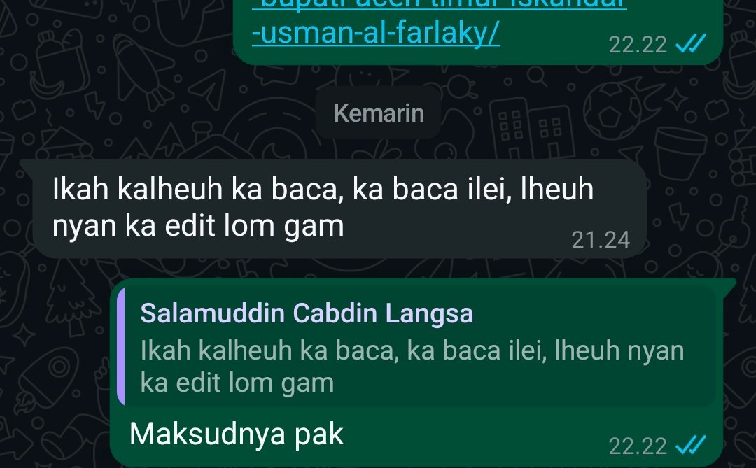 Yang membuat publik tercengang adalah ucapannya sendiri. Dalam bahasa Aceh, Salamudin Abang Bupati Iskandar Usman Alfarlaky melontarkan kalimat bernada emosi lewat pesan whatsapp nya.
