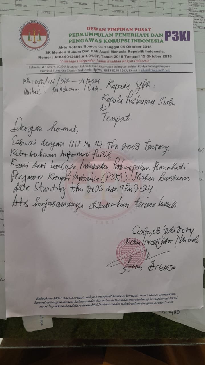Dari hasil Investigasi P3KI (Pemerhati Perkempulan Pengawas Korupsi Indonesia ) Ke UPTD Puskesmas Siabu untuk meminta data sunting di jawab Dr Emmy harus sesuai prosedur . Seketika itu juga tim Investigasi Memberikan Surat permohonan Informasi data Stuntin hingga detik ini belum di berikan oleh kepala UPTD puskesmas Siabu Dr Emyy Evawani. Tim investigasi berpendapat bahwa UPTD Puskesmas Siabu dengan sengaja menutup-nutupi data stunting di sebabkan dana stuntung yang disalurkan banyak difiktifkan , contoh kecil penerima stunting di desa tangga bosi I masyarakat cacat fisik , kaki tidak sempurna , dan tidak bisa beraktifitas tidak pernah menerima bantuan dana stunting yang di gembar-gemborkan oleh pemerintah , karena stunting adalah program pusat yang harus disampaikan kepada masyarakat yang bersangkutan sesuai dengan peraturan . Kata Arnes.