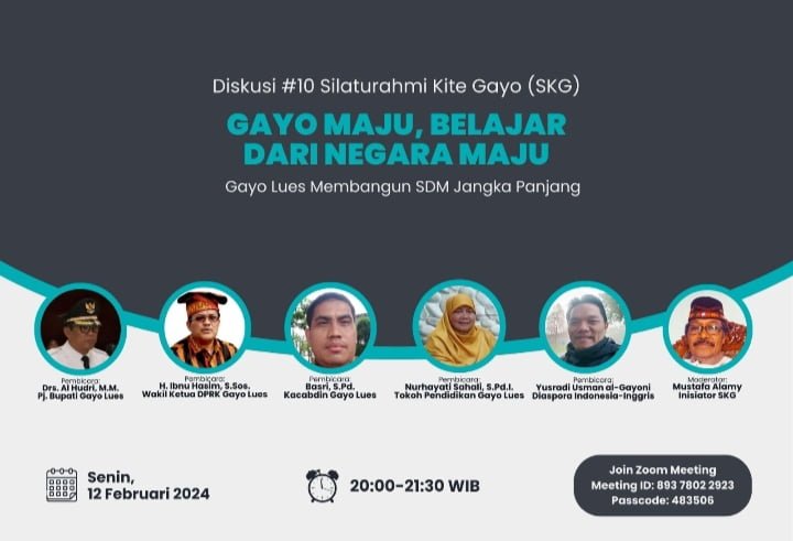 Dijelaskan Mustafa Alamy, diskusi ke-10 Silaturahmi Kite Gayo (SKG) dinarasumberi Drs. Al Hudri, M.M. (Pj Bupati Gayo Lues), H. Ibnu Hasim, S. Sos., M.M. (Wakil Ketua DPRK Gayo Lues 2019-2024/Bupati Gayo Lues 2007-2012, 2012-2017), Basri, S.Pd. (Kepala Cabang Dinas Pendidikan Wilayah Gayo Lues), Nurhayati Sahali, S.Pd.I. (Tokoh Pendidikan Gayo Lues), dan Yusradi Usman al-Gayoni (Diaspora Indonesia-Inggris/Anggota Muslim Cultural Welfare Association of Sutton, London, Inggris), dengan moderator, Mustafa Alamy sendiri. Lebih lanjut, bisa diikuti melalui tautan Zoom Meeting: https://us02web.zoom.us/j/89378022923?pwd=TUhqVFYwZnRsajBIZnMvekdPTEFHZz09, dengan Meeting ID: 893 7802 2923, dan Passcode: 483506