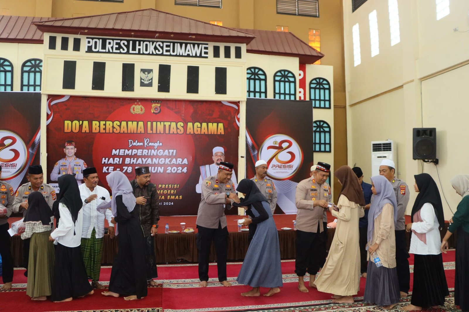 Dalam rangka memperingati Hari Ulang Tahun (HUT) Bhayangkara ke-78, Kepolisian Resor (Polres) Lhokseumawe mengadakan acara doa bersama dan tausiah yang diikuti oleh seluruh Pejabat Utama ( PJU) jajaran Polres Lhokseumawe dan anggota Polres Lhokseumawe serta tokoh masyarakat dan agama setempat. Acara yang digelar di Aula Serba Guna Polres Lhokseumawe, bertujuan untuk memperkuat spiritualitas dan kebersamaan antar anggota Polri serta masyarakat. 25 Juni 2024 – pagi.