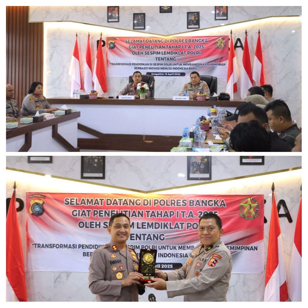 Sungailiat, Satupena.co.id – Dalam rangka mendorong transformasi pendidikan dan membangun kepemimpinan Polri berbasis inovasi, Tim Sekolah Staf dan Pimpinan (Sespim) Lemdiklat Polri melakukan kunjungan kerja ke Polres Bangka pada Senin (14/4/2025). Kegiatan berlangsung di Ruang Rupattama Polres Bangka dan disambut hangat oleh jajaran kepolisian setempat.