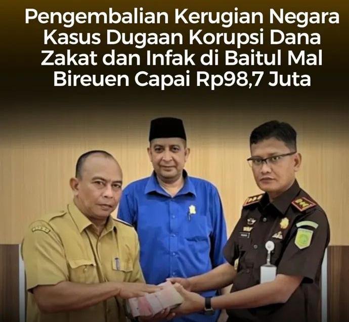 Bireuen- Satupena.co.id:  Dugaan tindak pidana korupsi dalam pengelolaan dana infak dan zakat di Baitul Mal Kabupaten Bireuen tahun anggaran 2024 memasuki babak baru. Kerugian keuangan negara sebesar Rp98.700.000 telah dikembalikan ke kas daerah.