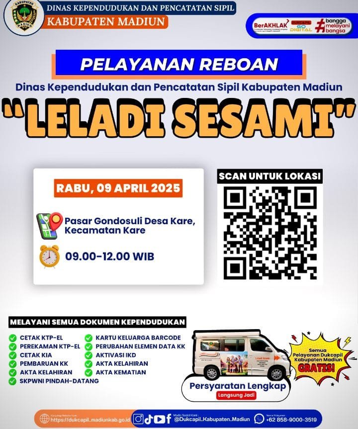 Madiun, Satupena.co.id. Dinas Kependudukan dan Pencatatan Sipil (DUKCAPIL) Kabupaten Madiun kembali menggelar layanan administrasi kependudukan bertajuk LELADI SESAMI “Reboan” pada Rabu, 9 April 2025.