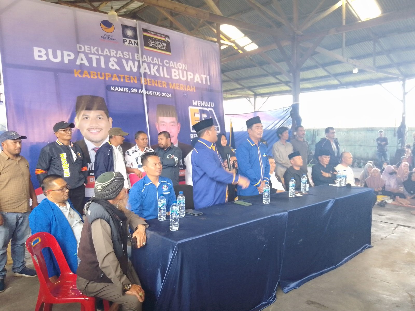 Bener Meriah-satupena.co.id: ERA Menag-ERA yes ,ERA menag-ERA yes, begitu lah suara gemuruh dari ratusan pendukung ERA yang di deklarasikan Partai NasDem untuk menjadi Bupati dan Wakil Bupati Bener Meriah periode 2024-2029 yang berlangsung di sekretariat DPD Partai NasDem Bener Meriah, Kamis 29 Agustus 2024.