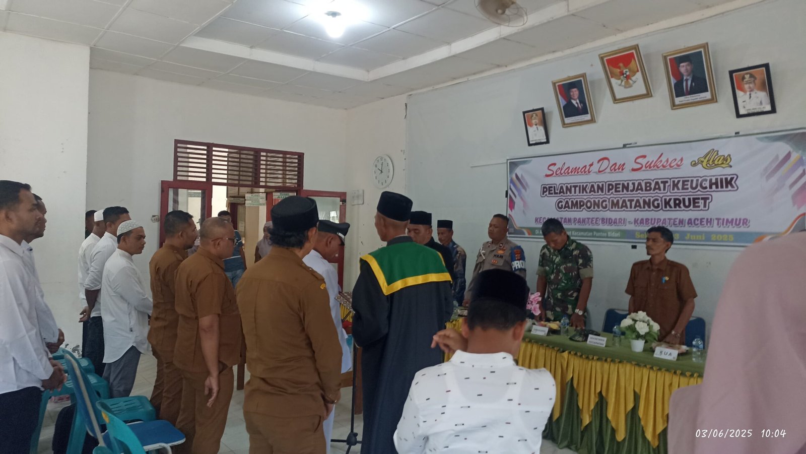 Pelantikan yang berlangsung khidmat di Aula Kantor Camat Pante Bidari ini dipimpin langsung oleh Camat Darkasyi, S.E., mewakili Bupati Aceh Timur. Acara tersebut dihadiri oleh jajaran Muspika Kecamatan Pante Bidari, Kapolsek dan Danramil Pante Bidari, Kepala KUA, tokoh masyarakat, serta sejumlah tamu undangan lainnya.