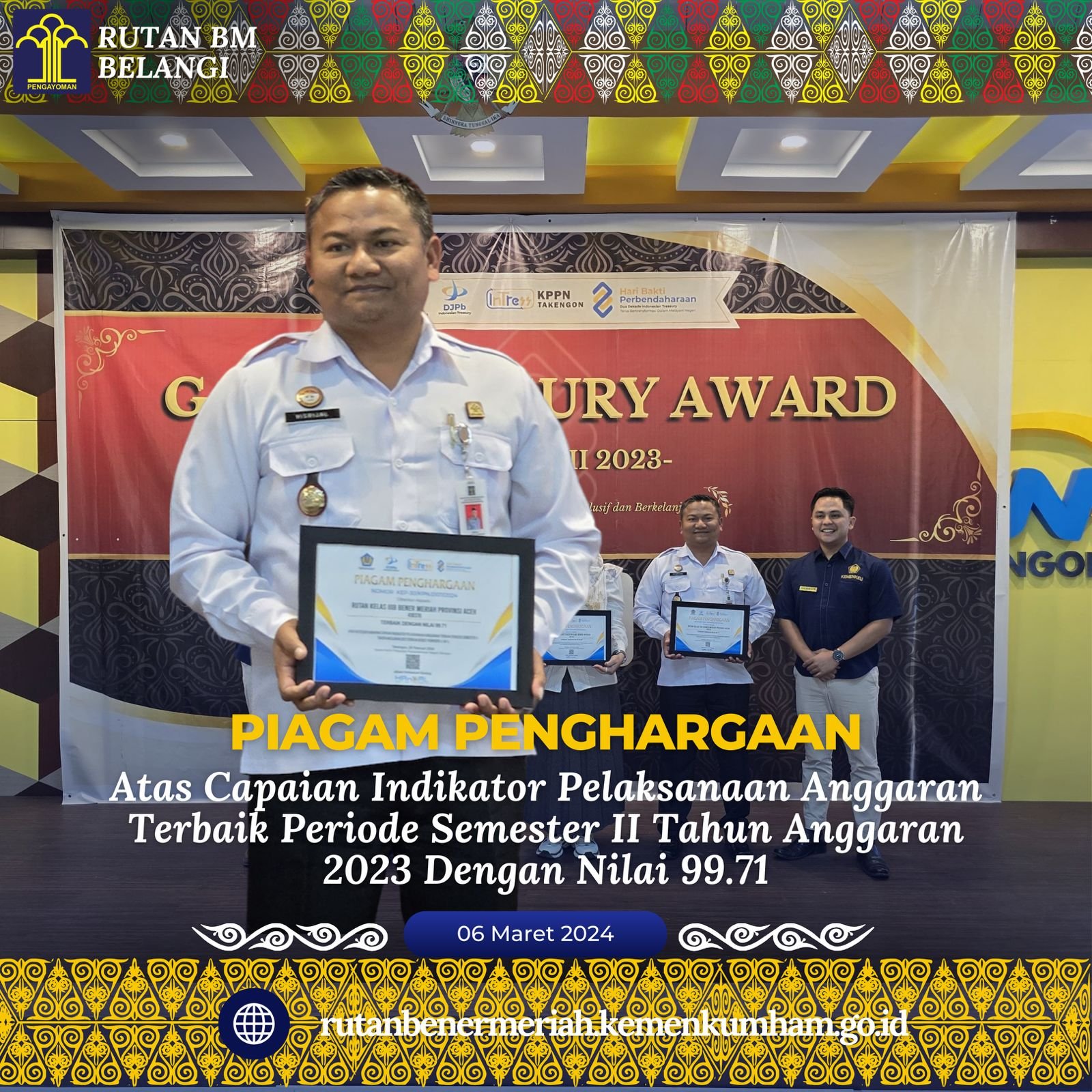Dalam kesempatan ini juga dilaksanakan kegiatan pemberian Pengahargaan satuan kerja terbaik “Gayo Treasury Award”, dalam hal ini Rumah Tahanan Negara Kelas IIB Bener Meriah menerima penghargaan kategori Harapan Capaian Indikator Pelaksanaan Anggaran (IKPA) terbaik periode Semester II Tahun 2023 dengan bobot konversi lebih besar sari 90%.