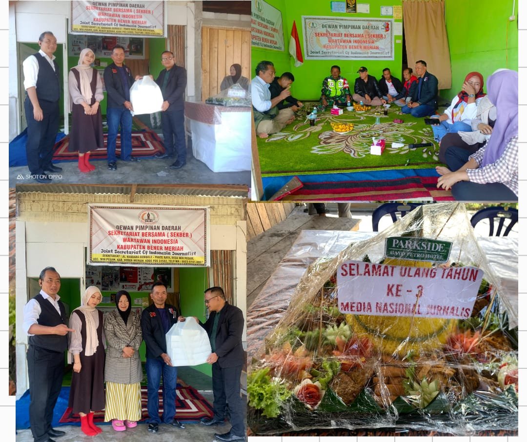 Bener Meriah, Satupena.co.id.– Suasana hangat penuh keakraban menyelimuti Kantor Sekretariat Bersama (Sekber) Wartawan Indonesia (SWI), Kabupaten Bener Meriah Senin (18/8/2025). Dalam rangka memperingati Hari Ulang Tahun ke-3 Media Nasionaljurnalis.com, manajemen Parkside Gayo Petro Hotel Takengon menyerahkan tumpeng sebagai bentuk apresiasi dan dukungan terhadap insan pers.