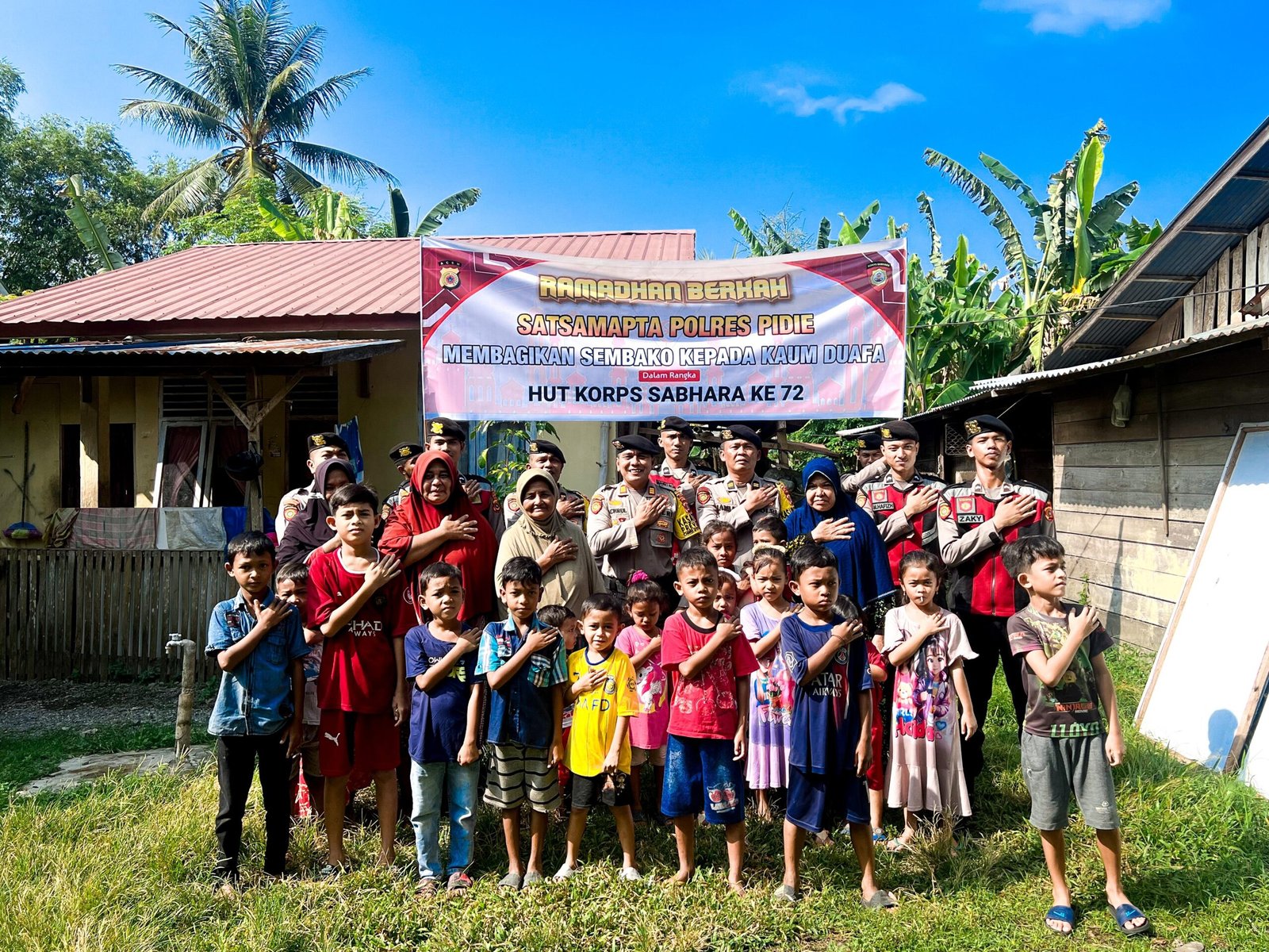 Memperingati HUT Korps Sabhara Baharkam Polri Ke-72 Tahun 2024, Satuan Samapta Polres Pidie Polda Aceh membagikan sembako kepada warga yang kurang mampu yang dilaksanakan di Gampong Cot Geunduk Kecamatan Pidie, adapun kegiatan tersebut dipimpin langsung oleh Kasat Samapta AKP Fachrul Razi, SKM, M.Si,. Jumat (22/3/2024)