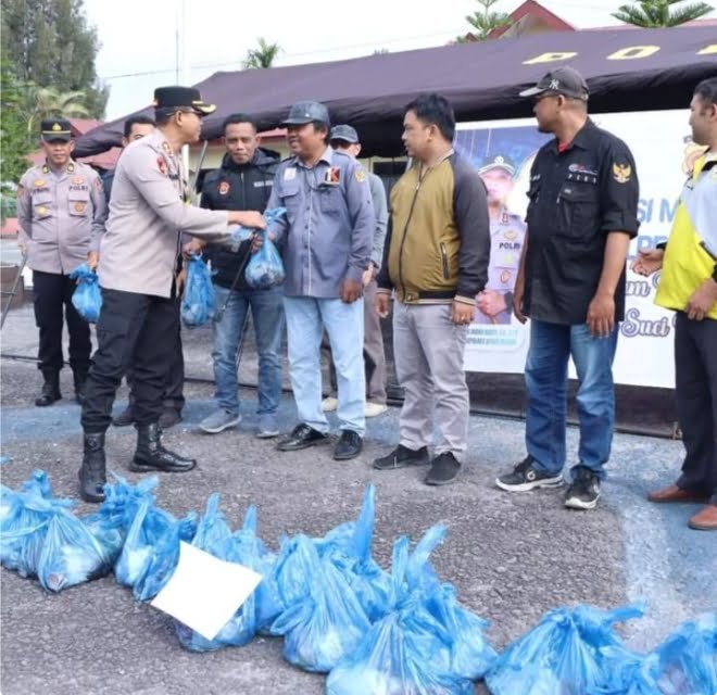 satupena.co.id: Kapolres Bener Meriah, AKBP Nanang Indra Bakti, S.H., S.I.K, telah membagikan daging Meugang, kepada seluruh personel Polres Bener Meriah, purnawirawan, Warakawuri, dan awak media. Acara pembagian berlangsung di halaman Mako Polres Bener Meriah pada Hari Sabtu, 9 Maret 2024.