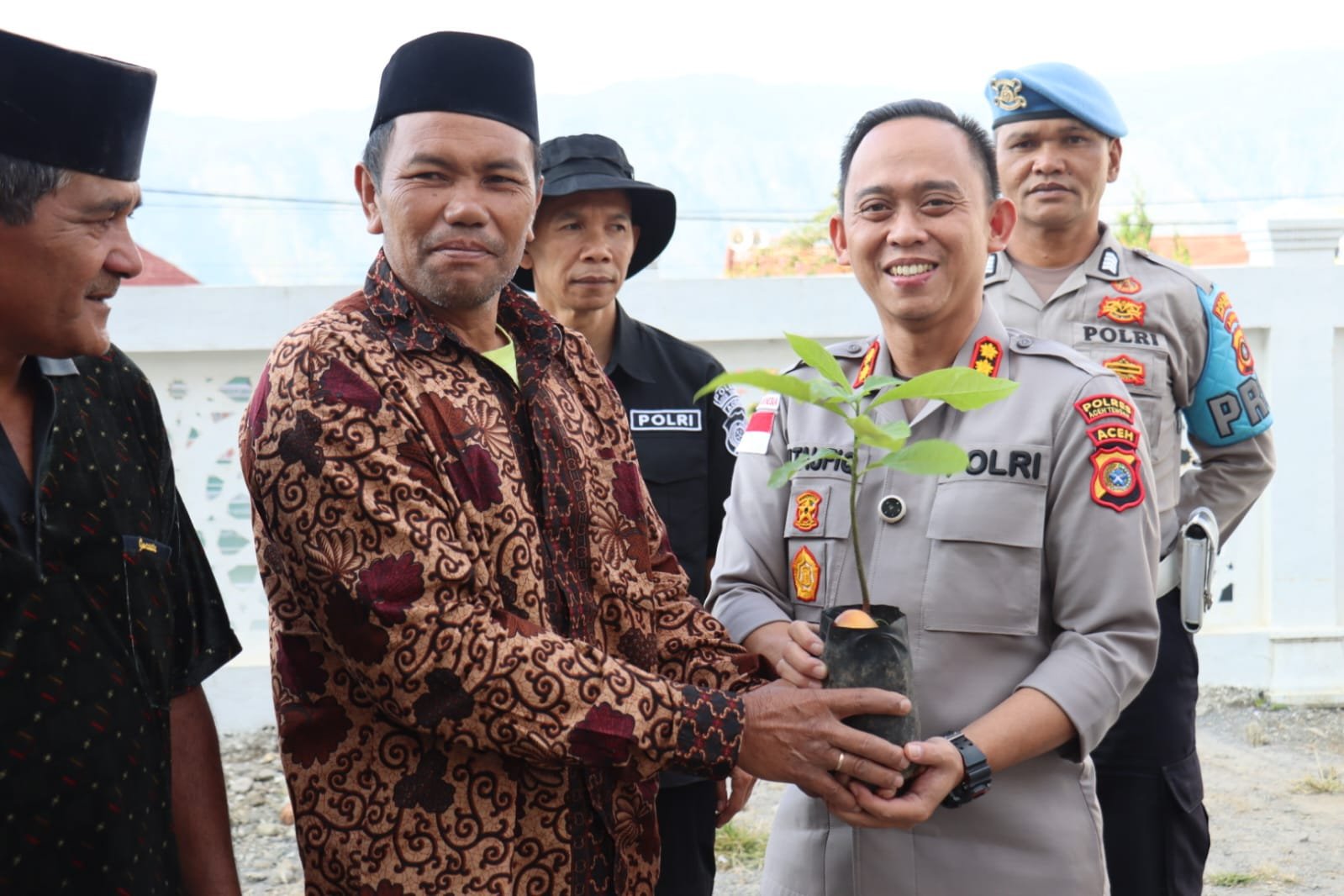 Selain paket sembako, Polres Aceh Tengah juga menyerahkan puluhan bibit tanaman buah kepada masyarakat sebagai bagian dari dukungan terhadap program Green Policing yang mendorong pelestarian lingkungan.